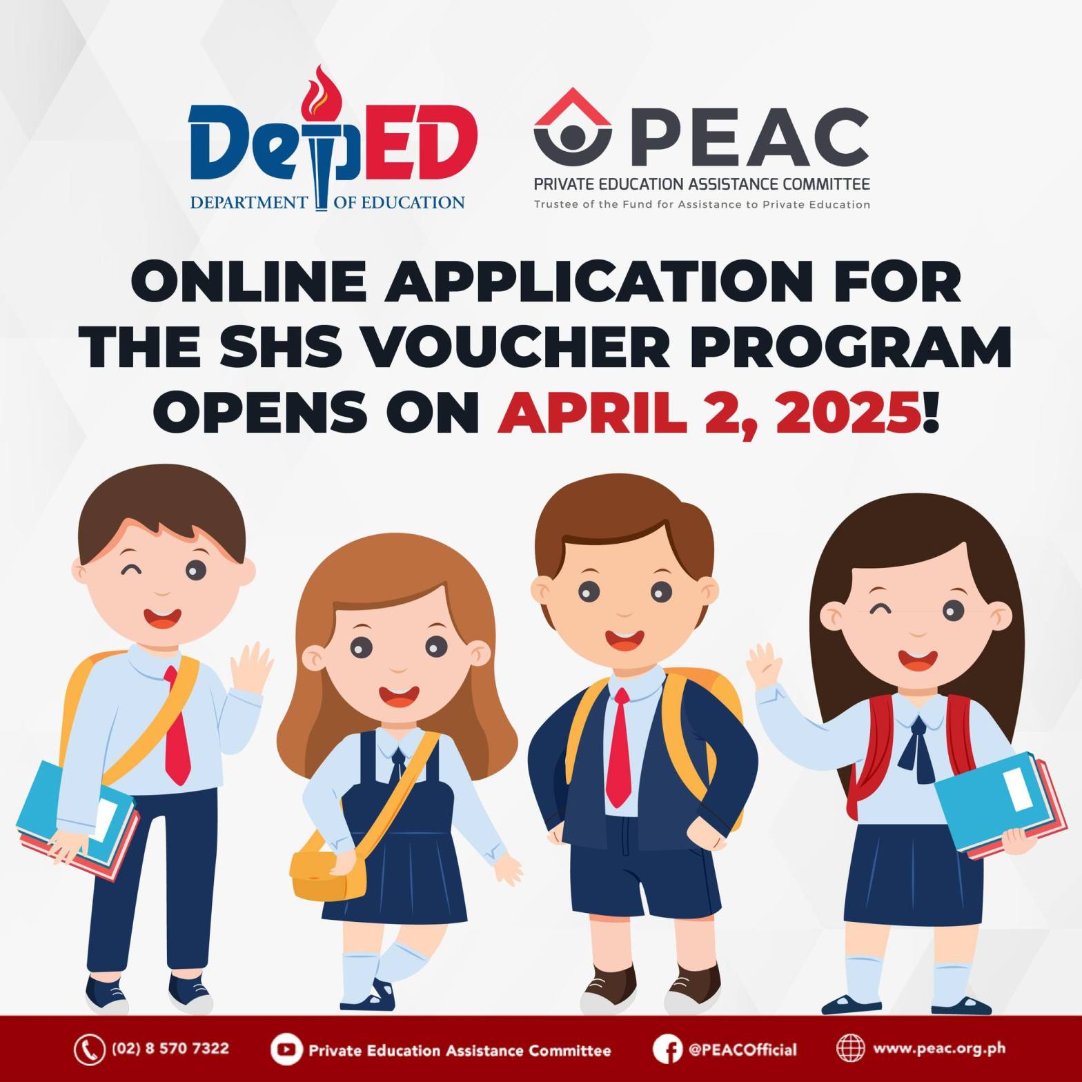 𝗔𝘁𝘁𝗲𝗻𝘁𝗶𝗼𝗻 𝗶𝗻𝗰𝗼𝗺𝗶𝗻𝗴 𝗴𝗿𝗮𝗱𝗲 𝟭𝟭 𝘀𝘁𝘂𝗱𝗲𝗻𝘁𝘀!! Please be informed that the online application for the 𝙎𝙃𝙎 𝙑𝙤𝙪𝙘𝙝𝙚𝙧 𝙋𝙧𝙤𝙜𝙧𝙖𝙢 will open on April 02, 2025 starting at 6:00pm. You may apply through this website https://ovap.peac.org.ph You may check the shared post below to know the procedures and detailed information of the application process. Please note that theContinue reading “Online application for the SHS Voucher Program”