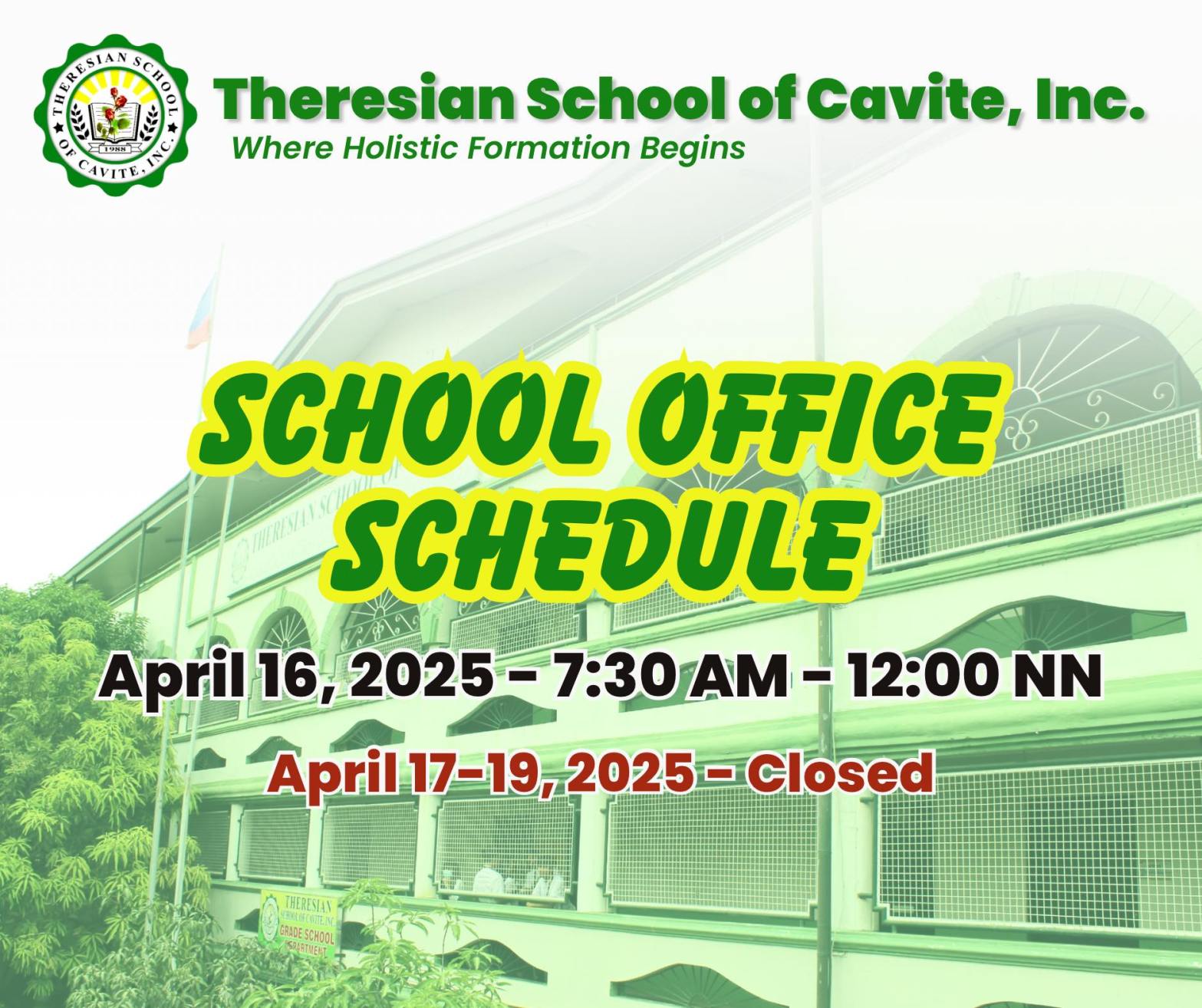 #TSCAdvisory In observance of Holy Week, please be informed that the School Office will be open on April 16, 2025, from 7:30 AM to 12:00 NN only. Kindly note that the cutoff for payments and transactions is 30 minutes before closing time. Please be guided accordingly.