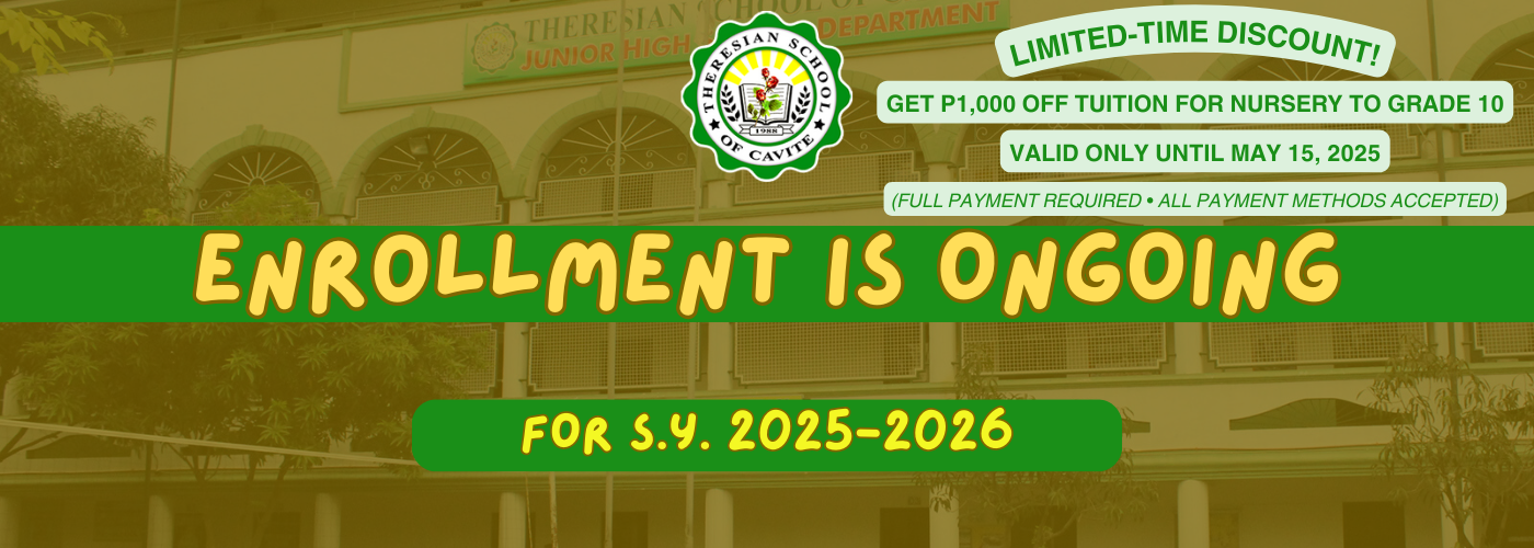 Theresian School of Cavite, Inc. is now accepting applications for new students for the upcoming School Year 2026โ2027. We welcome aspiring TSCians to be part of our growing academic community. We are accepting applicants from the levels of Pre-school (Nursery and Kindergarten), Grade School (Grade 1-6) and Junior High School (Grade 7-10), and incoming SeniorContinue reading “๐จ๐ ๐๐๐๐๐๐๐๐ ๐๐๐ ๐บ.๐. ๐๐๐๐-๐๐๐๐ ๐๐ ๐๐๐ ๐๐๐๐๐๐๐!”