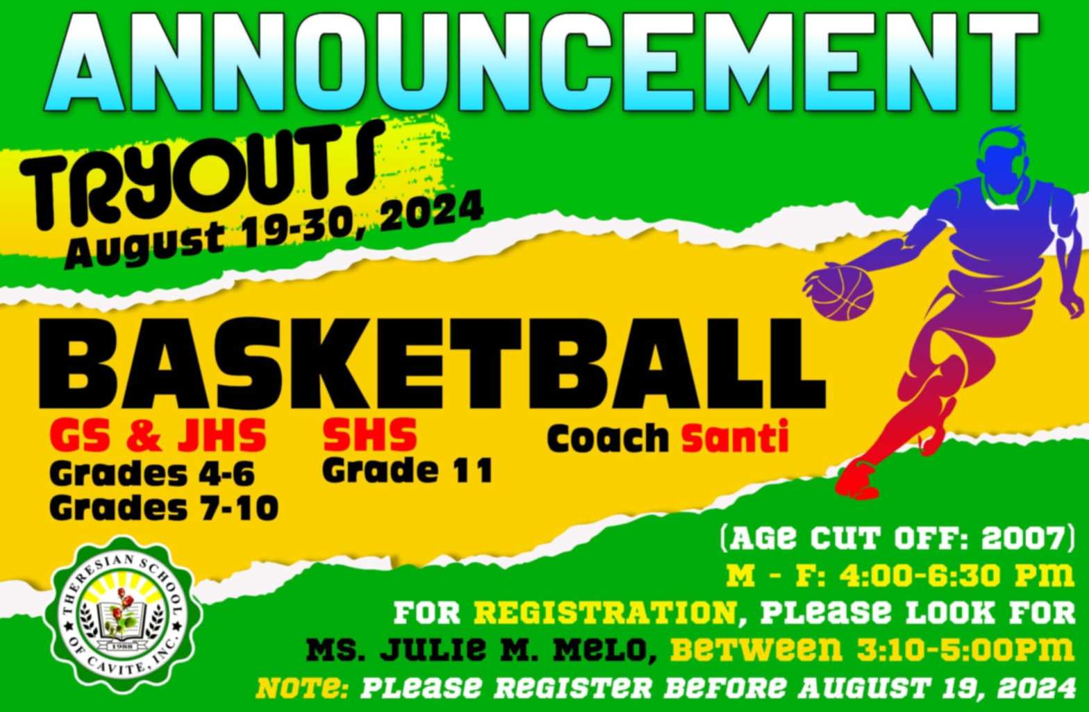 Calling all sport enthusiasts! Are you ready to showcase your skills and be part of an elite team? Come to our tryouts and show us your skills and talent! 𝗗𝗮𝘁𝗲: August 19-30, 2024 𝗦𝗽𝗼𝗿𝘁𝘀 𝘁𝗿𝘆𝗼𝘂𝘁𝘀: Badminton Basketball Table Tennis Volleyball (Please see posters of each sport for more information) 𝗥𝗲𝗴𝗶𝘀𝘁𝗿𝗮𝘁𝗶𝗼𝗻: 𝙋𝙡𝙚𝙖𝙨𝙚 𝙧𝙚𝙜𝙞𝙨𝙩𝙚𝙧 𝙗𝙚𝙛𝙤𝙧𝙚 𝗔𝘂𝗴𝘂𝘀𝘁 𝟭𝟵,Continue reading “Announcement Sports Tryouts”